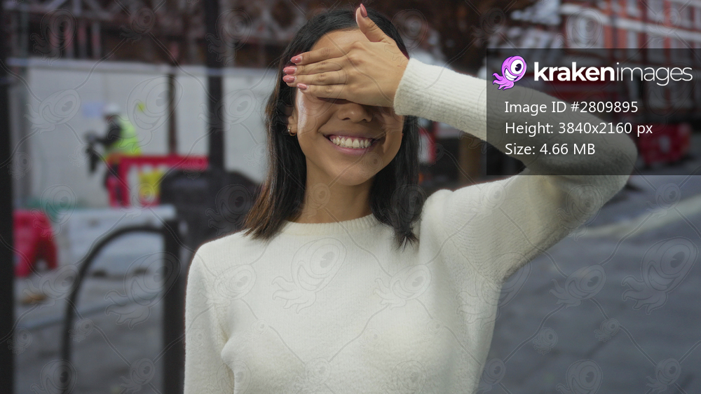 Young hispanic woman smiles playfully at construction site, covering eyes with hand, showcasing cheerful spirit amidst urban backdrop.