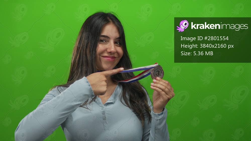 Young hispanic woman smiles while holding a bronze medal with thumb raised against a green studio wall; confidence success achievement pride.