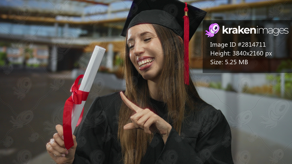 Young hispanic woman smiles while holding diploma and pointing finger in building; achievement pride.