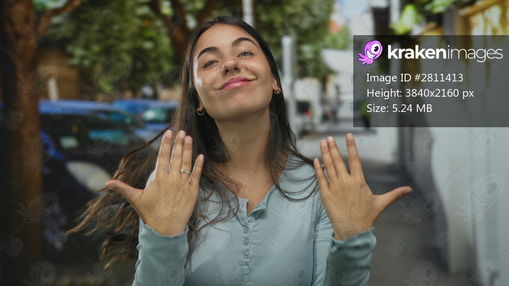 Young hispanic woman smiles while pointing both index fingers to camera on street; friendly invitation.