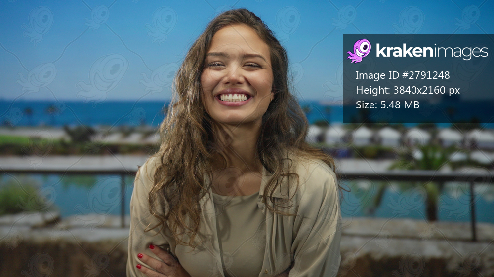 Young hispanic woman smiling with arms crossed on a sunlit street near a boat at the seaside port; rejection confidence.