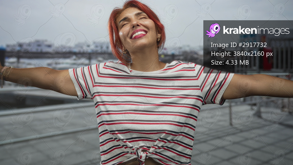 Young hispanic woman smiling with arms outstretched, forearms visible and knotted striped shirt on building rooftop terrace by boats at a port; serenity. - Kraken Images