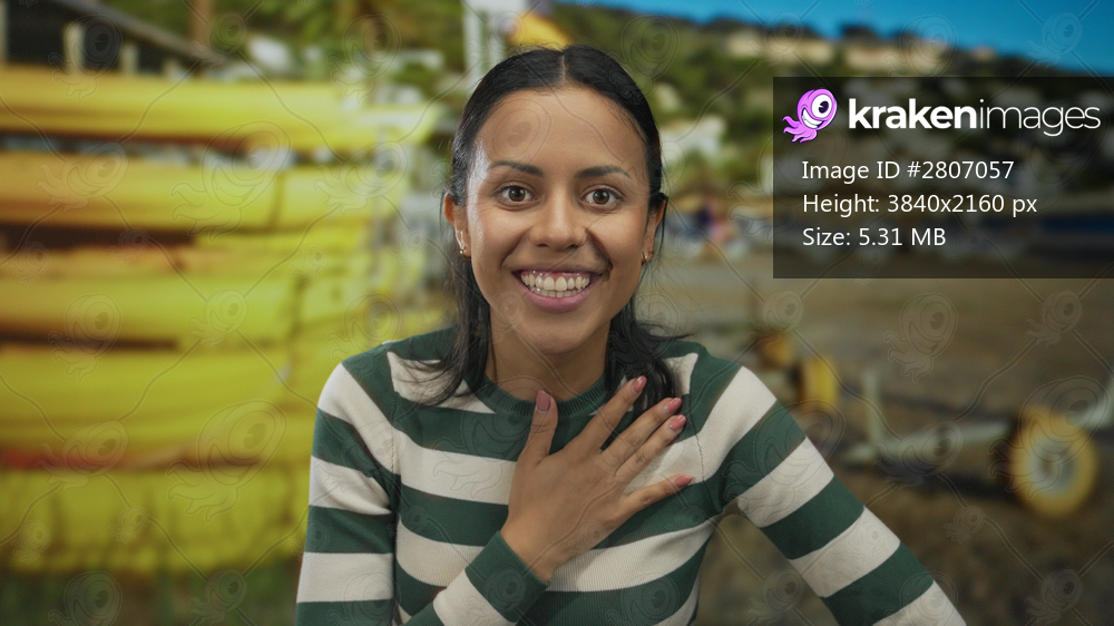 Young hispanic woman smiling at a seaside beach with yellow kayaks and a lively outdoor setting under a sunny sky