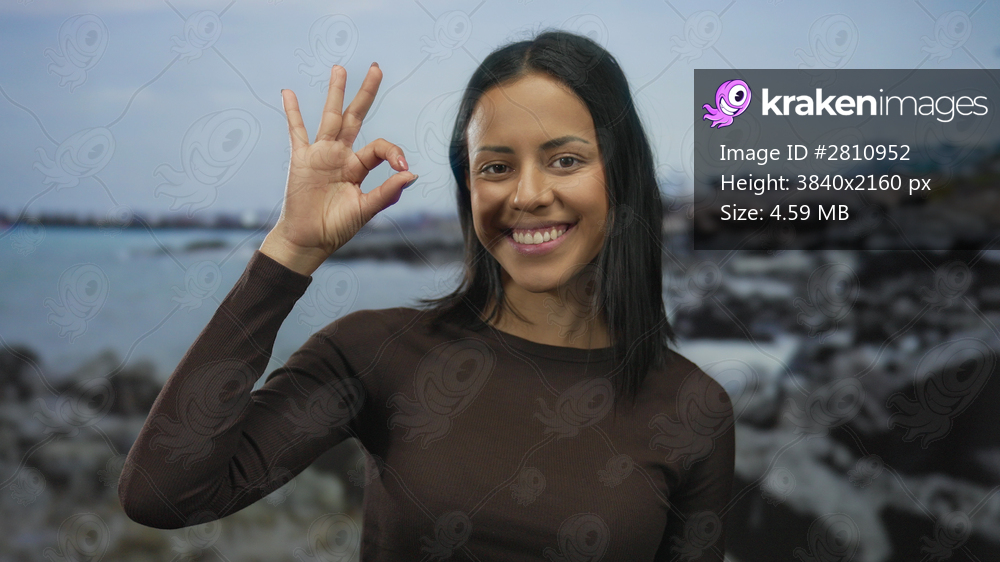 Young hispanic woman smiling at seaside beach outdoors with closed eyes, enjoying the ocean breeze with serene expression against rocky coastline backdrop. - Kraken Images