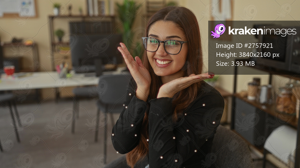 Young hispanic woman smiling at workplace in an office with modern interior decor and casual atmosphere, showing confident expression in a professional setting. - Kraken Images