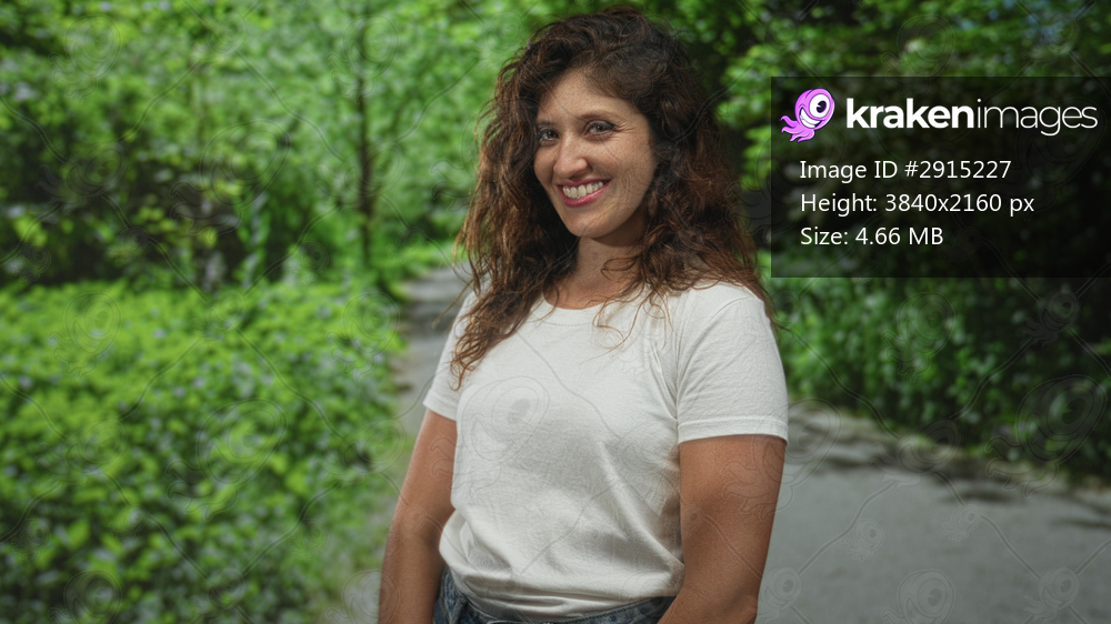 Young hispanic woman smiling with bare forearms on forest path near green foliage and park trail; joy confidence.