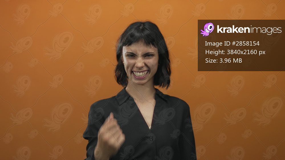 Young hispanic woman smiling broadly points finger to camera in studio against orange wall; confidence.