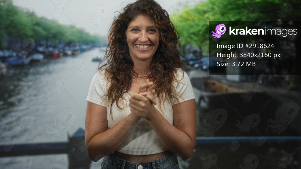 Young hispanic woman smiling and clapping with midriff visible while standing on a canal street in amsterdam; carefree joy.