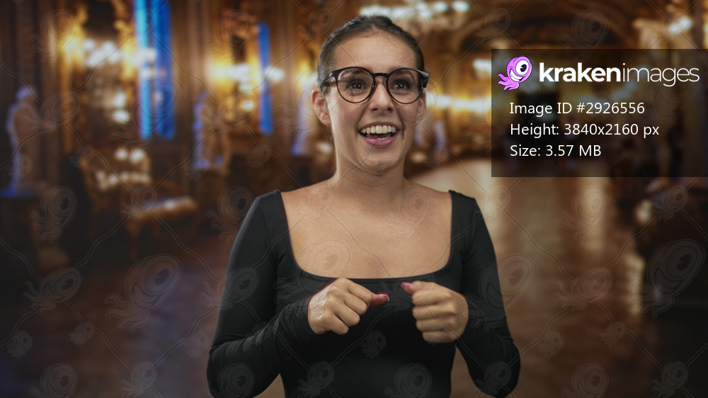 Young hispanic woman smiling with clenched fists and glasses in a museum building, hands raised near chest in excited pose; excitement celebration success. - Kraken Images
