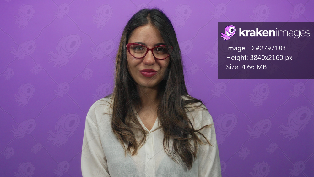 Young hispanic woman smiling confidently against a vibrant purple background wearing glasses and a white shirt, embodying a joyful and approachable demeanor in an isolated setting. - Kraken Images
