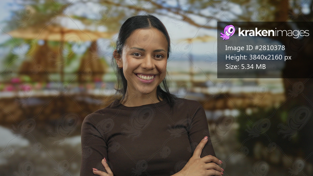 Young hispanic woman smiling confidently outdoors with arms crossed under a tree on a sunny day where colorful flowers bloom elegantly in the blurred background. - Kraken Images