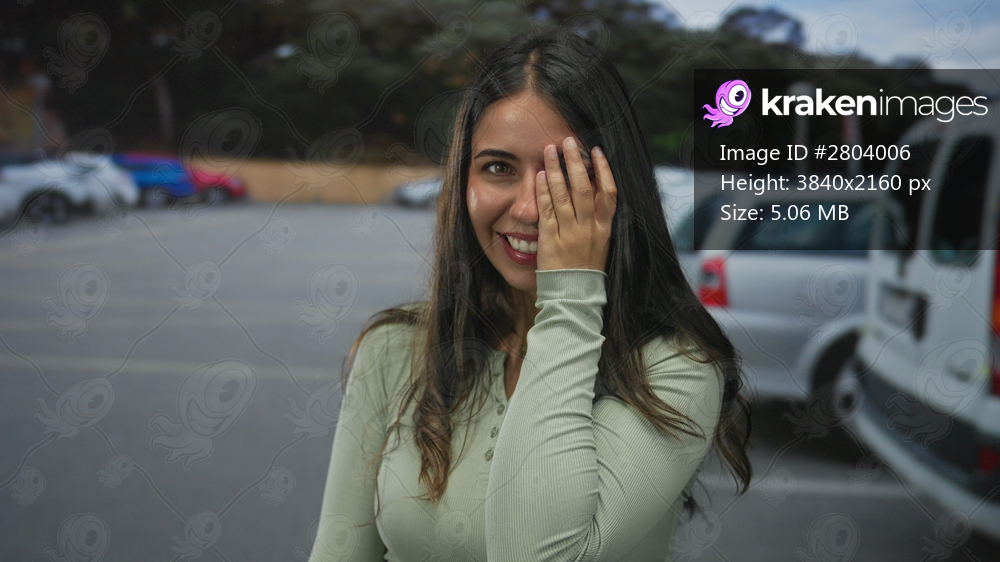 Young hispanic woman smiling covers eye with hand among parked cars on sunlit street outdoors; playfulness.