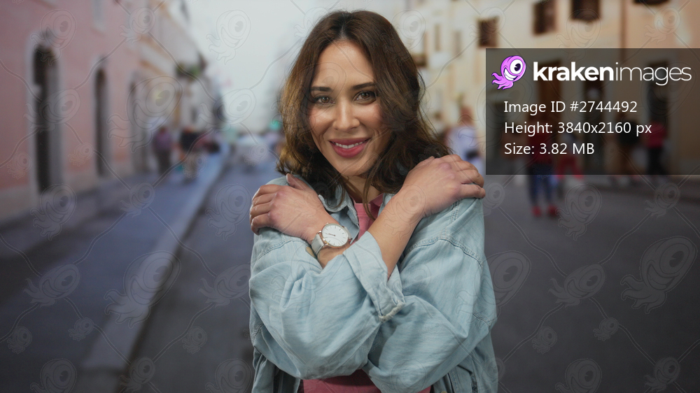 Young hispanic woman smiling and embracing herself joyfully on a bustling city street capturing a moment of happiness and empowerment among urban life. - Kraken Images