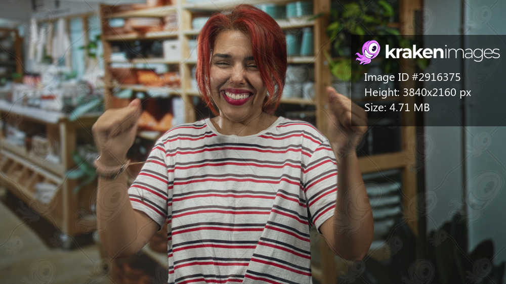 Young hispanic woman smiling with fists raised, dancing with eyes closed in a home decor store; joy celebration shopping.