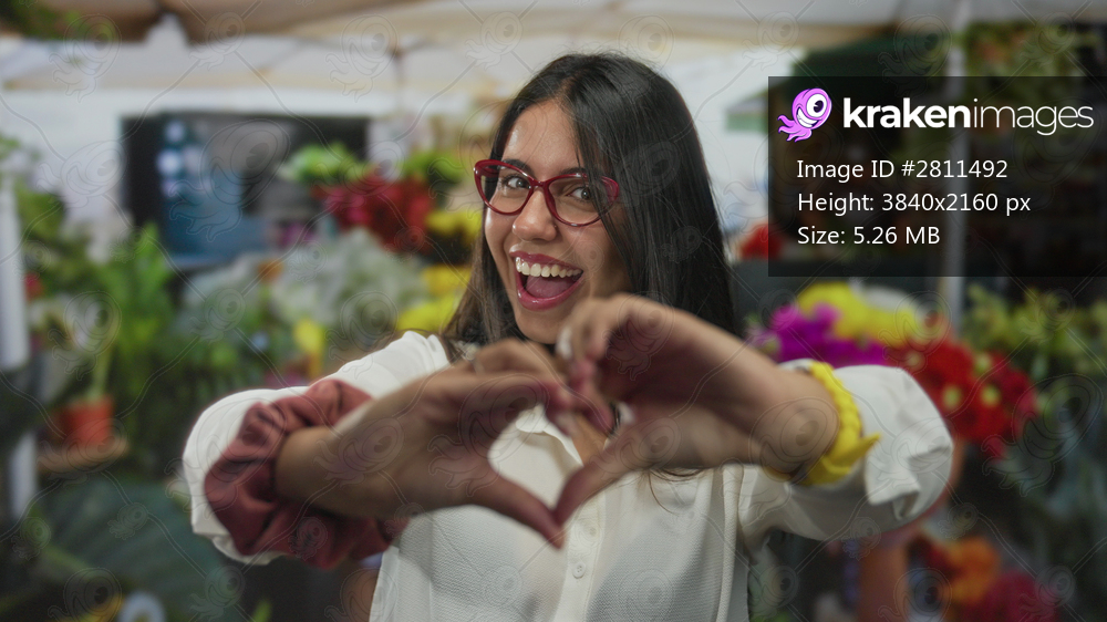Young hispanic woman smiling and forming a heart shape with her hands in an outdoor flower shop surrounded by vibrant blossoms and lush greenery under a sunny sky. - Kraken Images