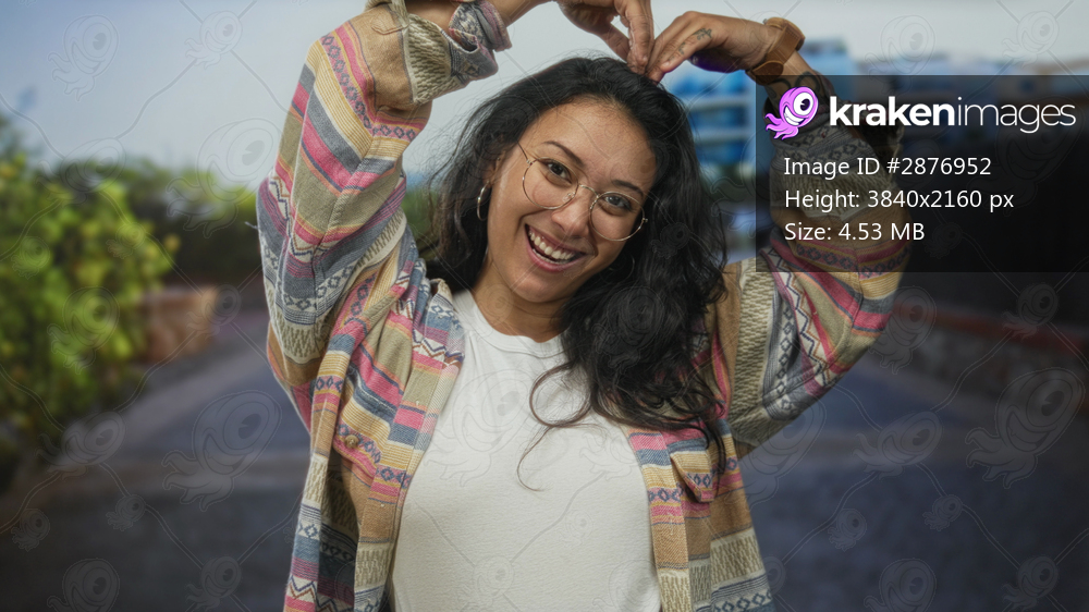 Young hispanic woman smiling and forming heart with hands above head on street near building wearing patterned jacket and glasses; joy friendship.