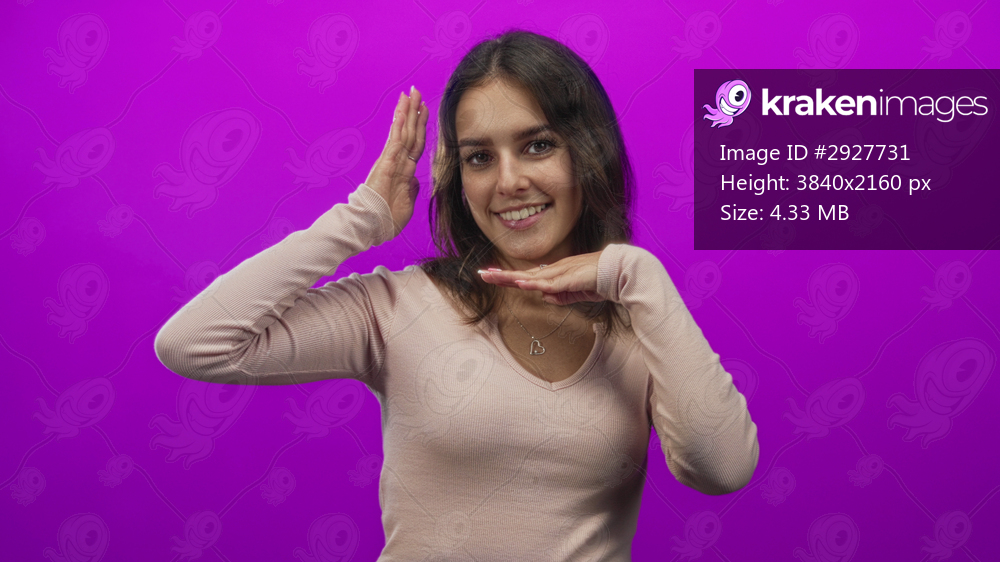 Young hispanic woman smiling and framing face with hands in a purple studio, wearing heart pendant and casual sweater; playful joy.