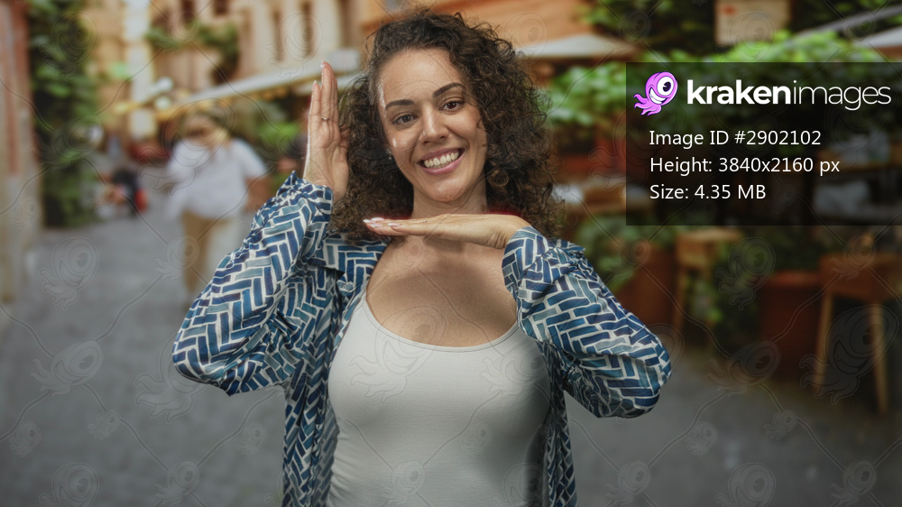 Young hispanic woman smiling and framing her face with hands on a street restaurant terrace near outdoor tables; joy confidence pose.