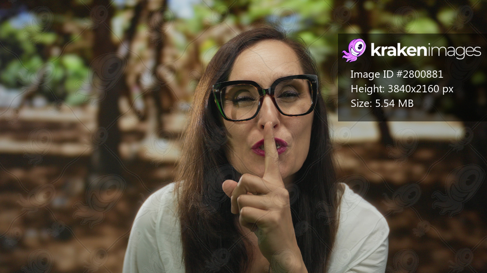 Young hispanic woman smiling gently with finger to lips for silence in lush sunlit park; hush secrecy quiet.
