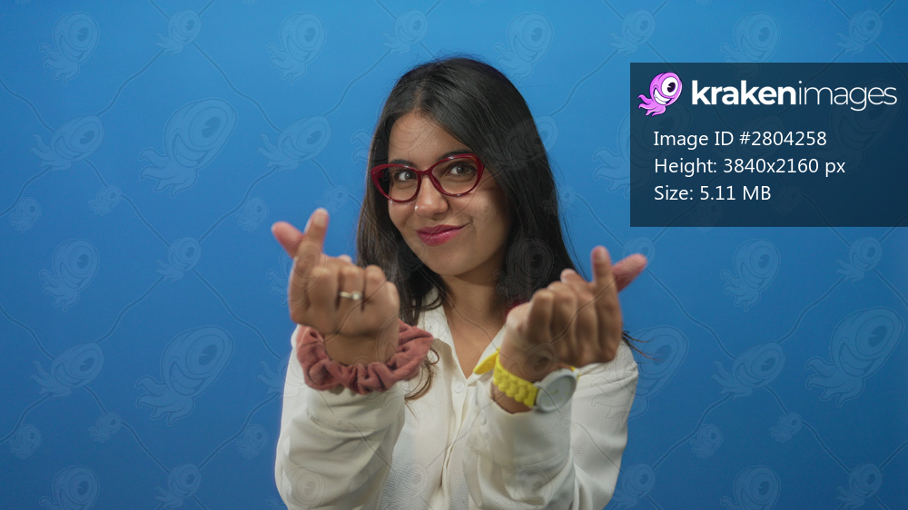Young hispanic woman smiling gently makes finger heart gesture in studio against bright blue wall; love.
