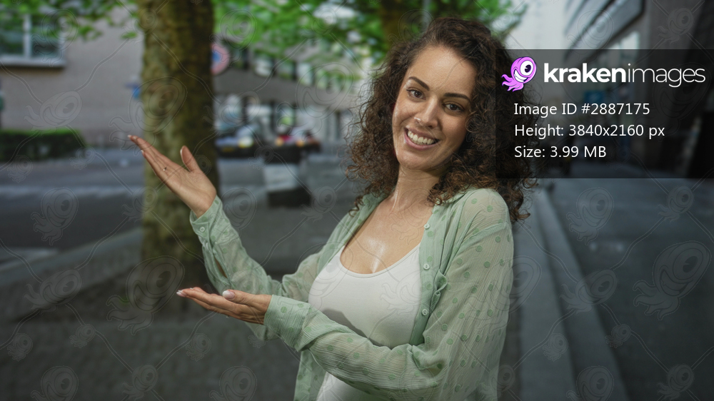 Young hispanic woman smiling and gesturing with open hands on city street, presenting a space for text or product; happiness welcome.
