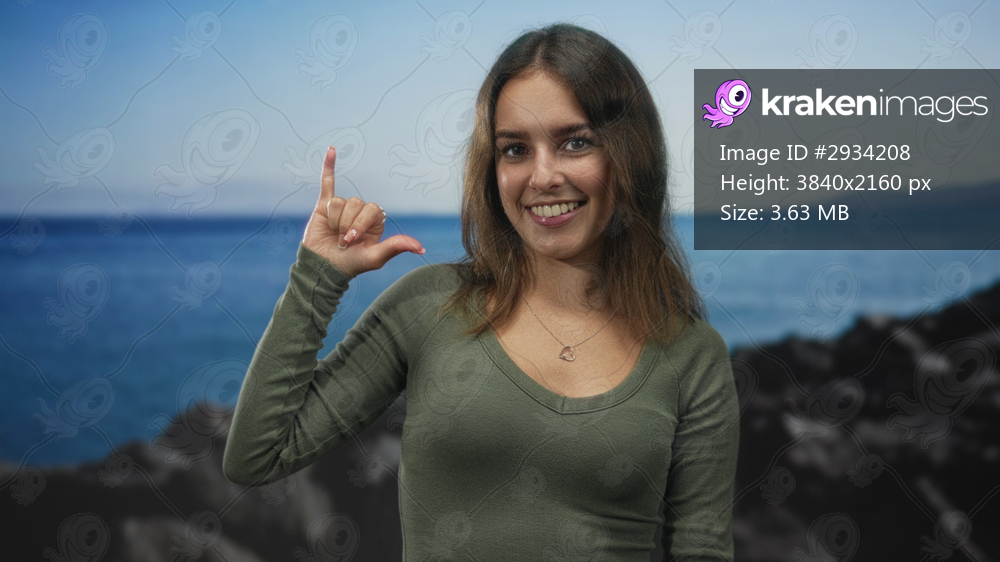 Young hispanic woman smiling, hand forming l sign with heart necklace visible at rocky coast by the sea; playful confidence.