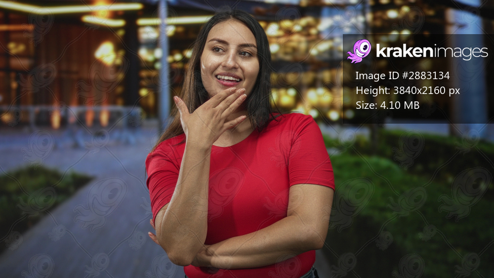Young hispanic woman smiling with hand on chin and crossed arms in front of lit building facade at night; confidence warmth friendliness.