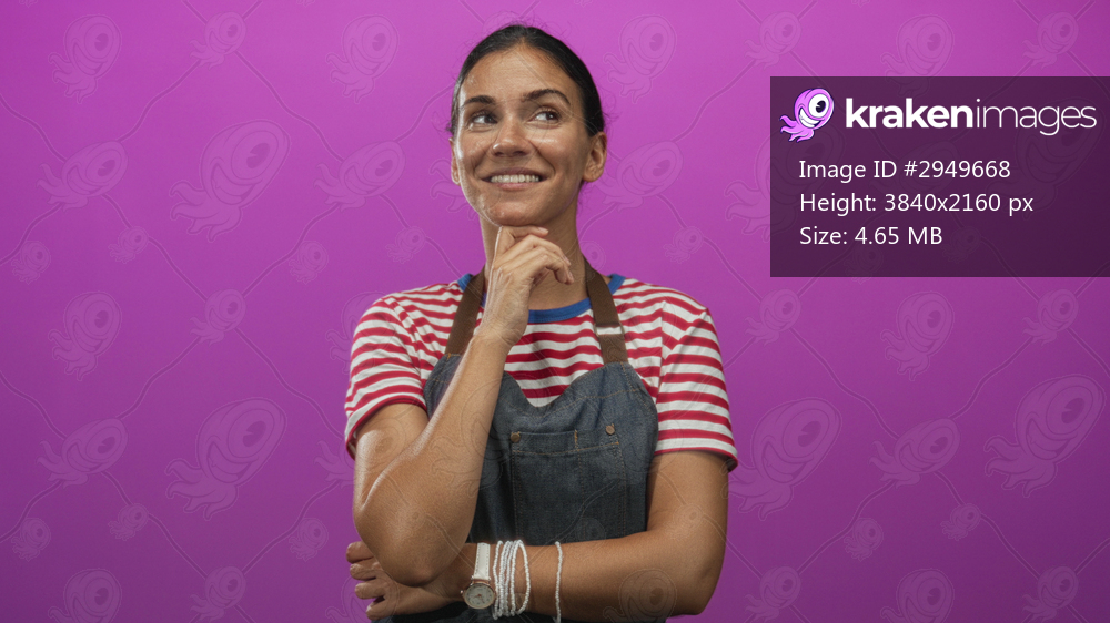 Young hispanic woman smiling with hand on chin wearing striped shirt and denim apron in purple studio; confidence.