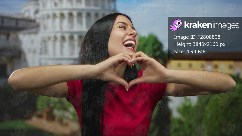 Young hispanic woman smiling with heart hands in front of the pisa tower in an outdoor city setting.