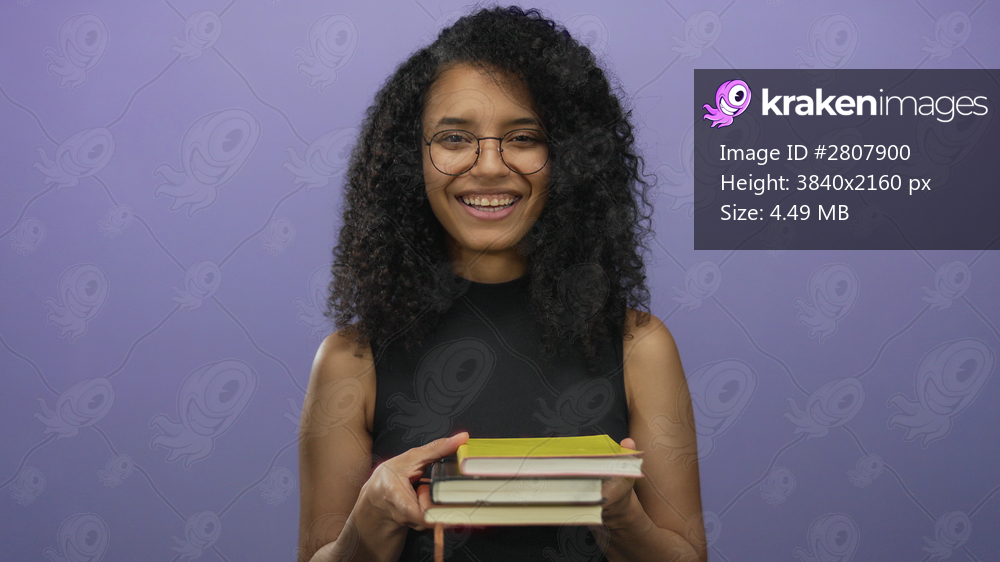 Young hispanic woman smiling and holding books against an isolated purple background, showcasing a vibrant and studious atmosphere.