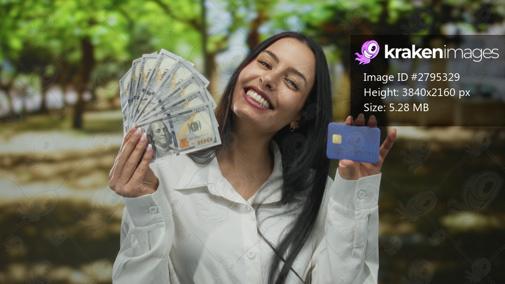 Young hispanic woman smiling holding dollar bills and credit card in park outdoor setting under green trees sunlight enhancing cheerful economic themes - Kraken Images