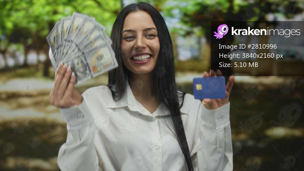 Young hispanic woman smiling holding dollar bills and credit card in park outdoor setting under green trees sunlight enhancing cheerful economic themes - Kraken Images