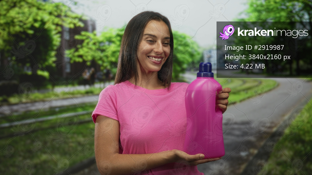 Young hispanic woman smiling and holding large pink detergent bottle on street near tram tracks; everyday cleaning cheerful.