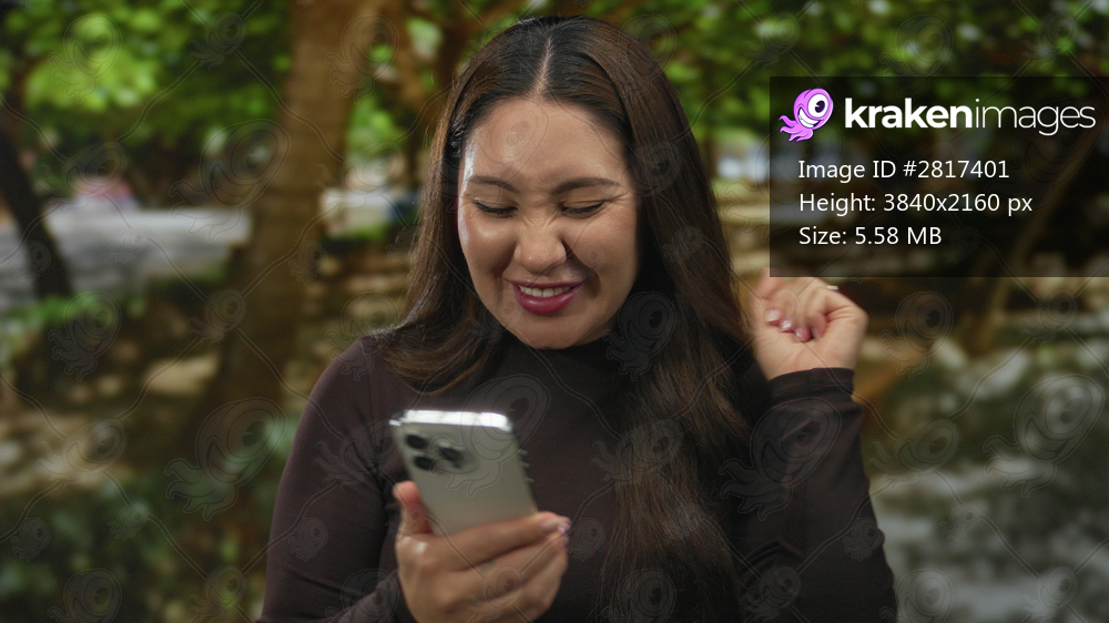 Young hispanic woman smiling and holding smartphone pumps fist under leafy trees in green park; joy triumph excitement celebration.