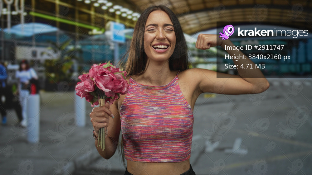 Young hispanic woman smiling holds pink bouquet and flexes right arm at airport terminal outdoors; confidence celebration.