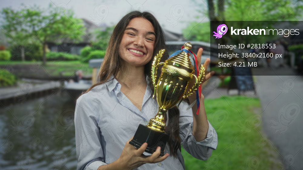 Young hispanic woman smiling holds trophy and pumps fist on street by river channel; pride achievement.