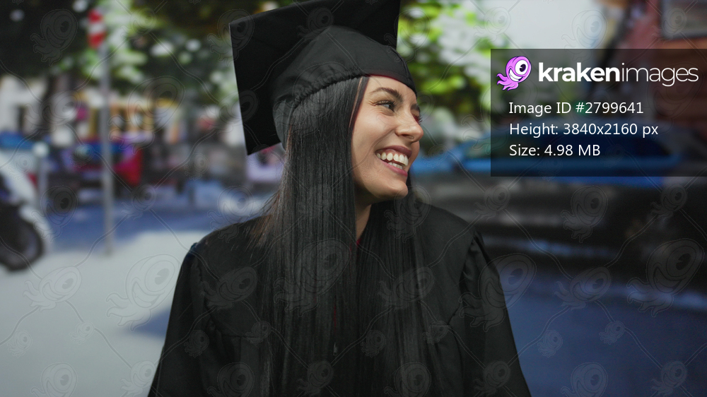 Young hispanic woman smiling in graduation uniform on a city street, capturing the joyful moment of academic achievement with an outdoor urban backdrop. - Kraken Images