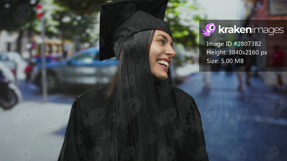 Young hispanic woman smiling in graduation uniform on a city street, capturing the joyful moment of academic achievement with an outdoor urban backdrop. - Kraken Images
