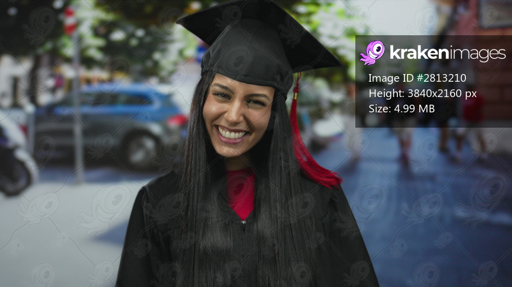 Young hispanic woman smiling in graduation uniform on a city street, capturing the joyful moment of academic achievement with an outdoor urban backdrop. - Kraken Images