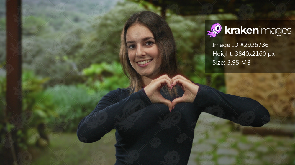 Young hispanic woman smiling makes heart with hands in forest near a rustic stone building and green field; love connection kindness.