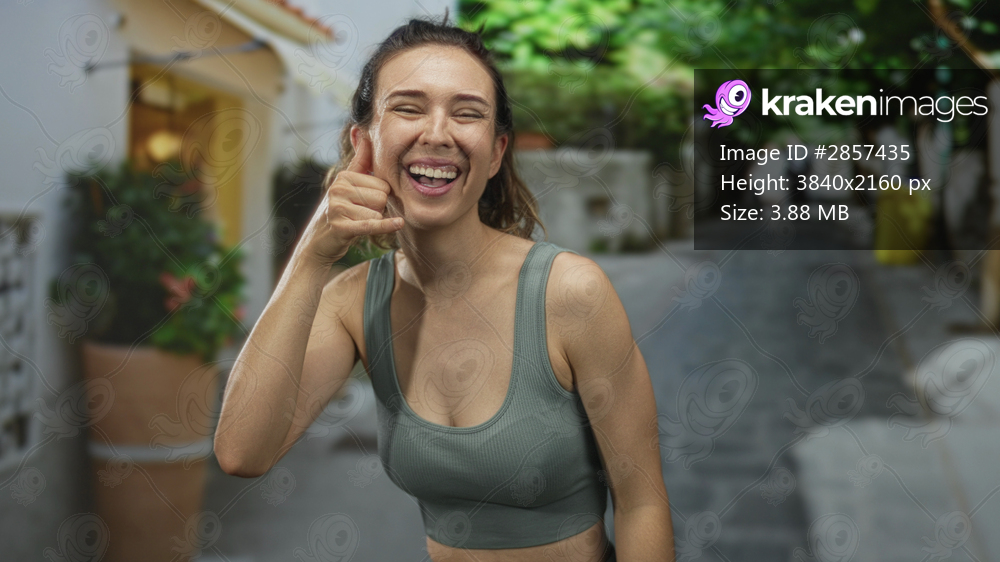 Young hispanic woman smiling and making call sign with her hand in sunlit bustling urban street; playfulness.