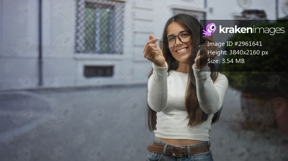 Young hispanic woman smiling and making finger heart gesture with both hands on a city street in front of a building and potted shrub; playful affection joy. - Kraken Images