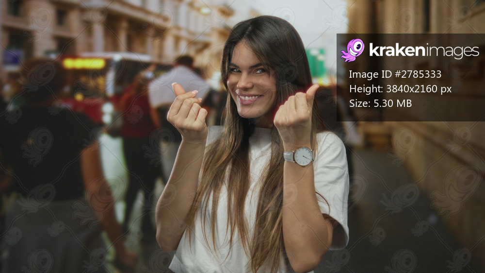 Young hispanic woman smiling making money gesture on busy city street during daytime with blurred pedestrians and buildings in the background.