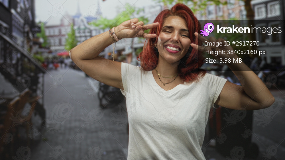 Young hispanic woman smiling and making peace sign with both hands on a lively city street with bicycles and cafes blurred behind her; joy carefree confidence. - Kraken Images