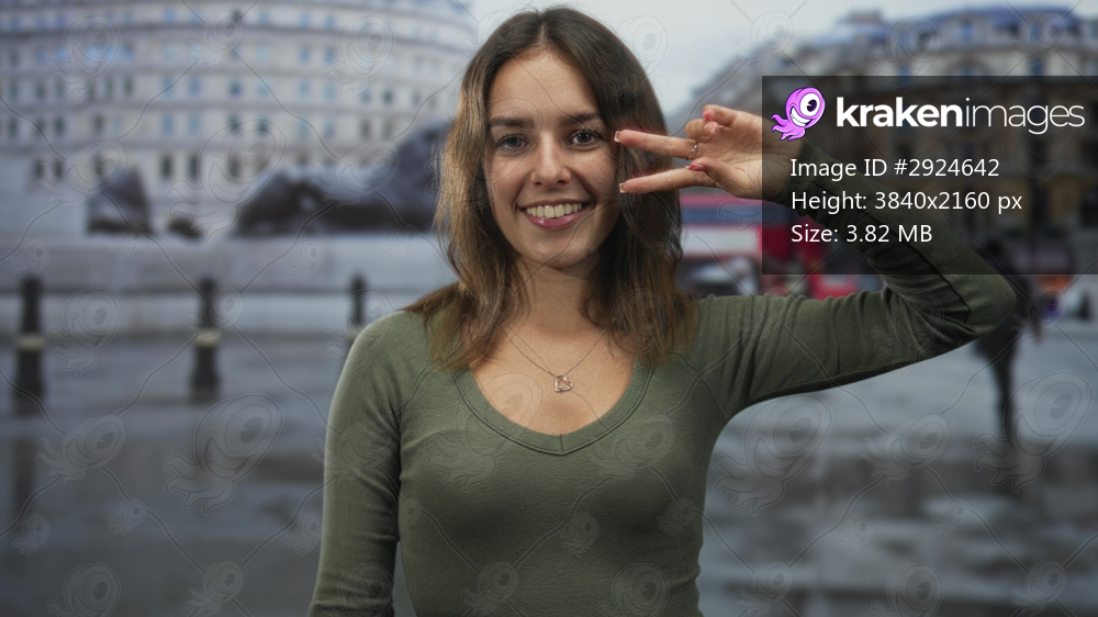Young hispanic woman smiling and making peace sign near face on wet city street, wearing green shirt and heart necklace; youthful joy.