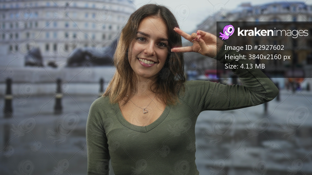 Young hispanic woman smiling and making peace sign near face on wet city street, wearing green shirt and heart necklace; youthful joy.