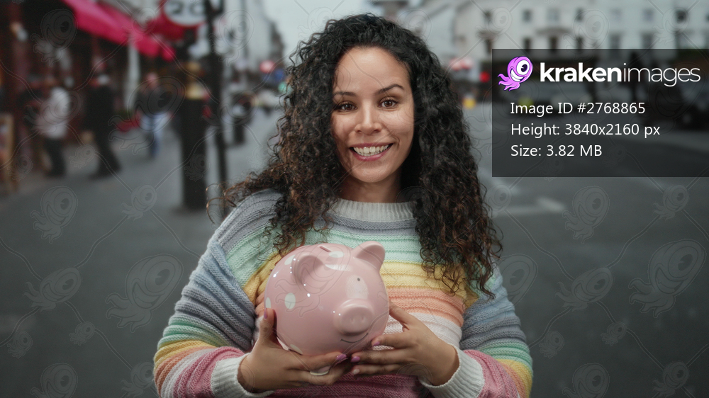 Young hispanic woman smiling on a street holding a pink piggy bank surrounded by an urban outdoor setting known for activity.