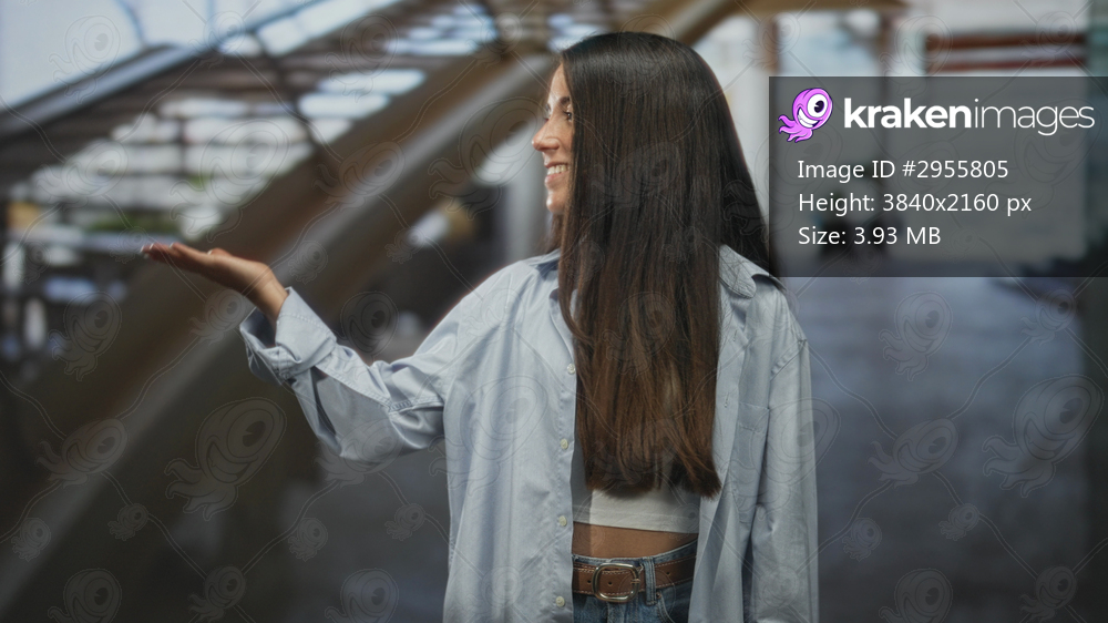 Young hispanic woman smiling with open palm gesture in airport terminal, wearing white crop top and blue shirt; friendly confidence.