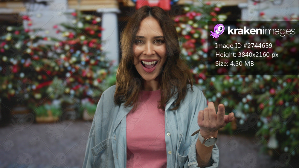 Young hispanic woman smiling outdoors in a festive decorated city street while feeling excited during winter holiday season, capturing joyful expressions and vibrant atmosphere. - Kraken Images