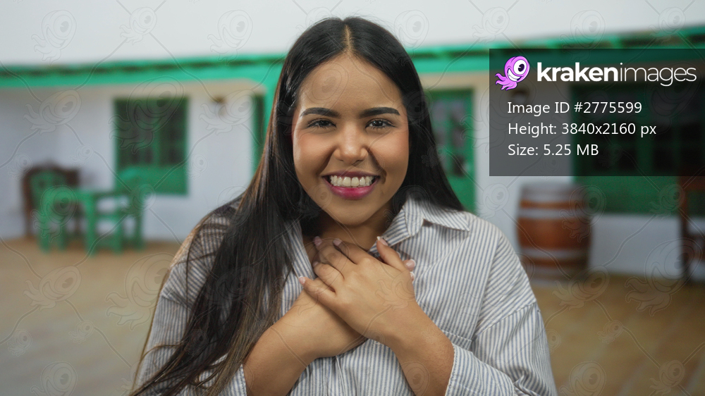 Young hispanic woman smiling outdoors near traditional building with green accents showing joyful expression through her gestures.